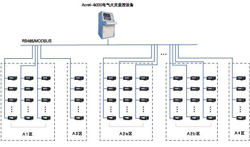 大型建筑群,樓層高,多棟樓體分散。采用Acrel-6000/Q電氣火災(zāi)監(jiān)控設(shè)備+Acrel6000/B電氣火災(zāi)監(jiān)控設(shè)備+電氣火災(zāi)監(jiān)控探測(cè)器三層結(jié)構(gòu)組網(wǎng)模式,便于區(qū)域化管理,采用RS-485網(wǎng)絡(luò)通信,以太網(wǎng)通信,滿足了通信實(shí)時(shí)性高的要求。